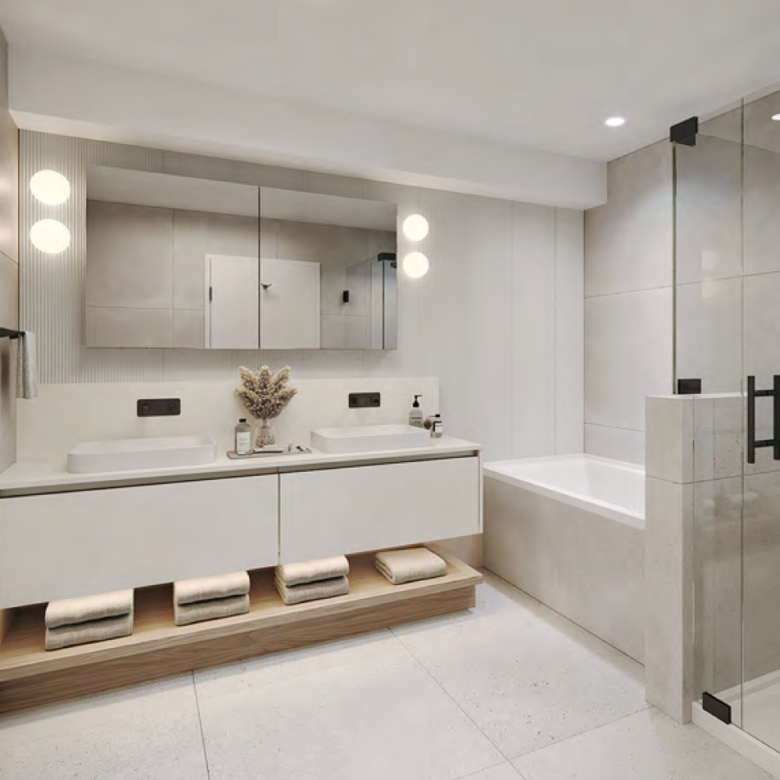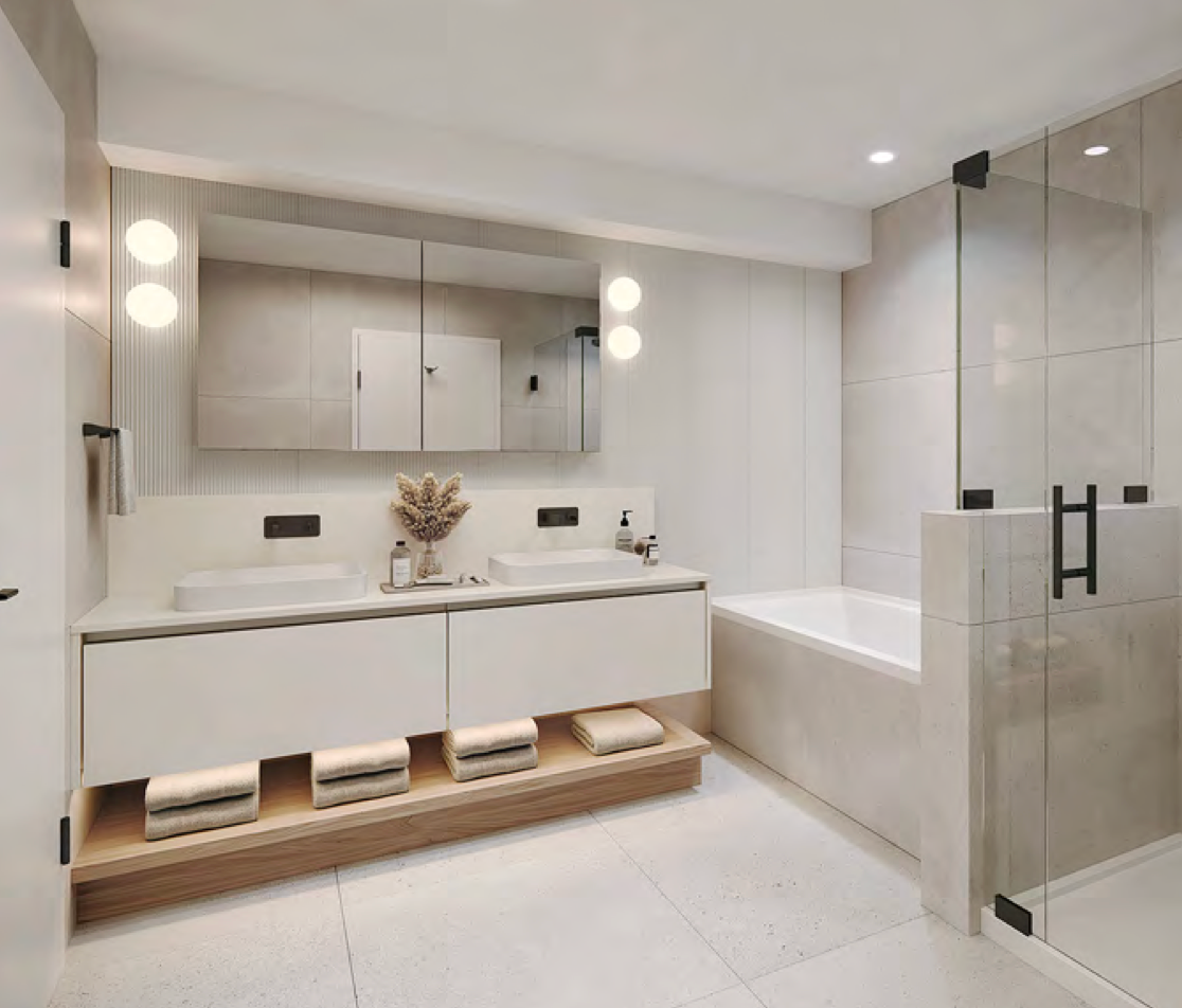 Modern bathrooms offer porcelain tilework, floating vanities, matte-black fixtures and luxury soaker tubs in select homes—delivering a refined finish throughout.